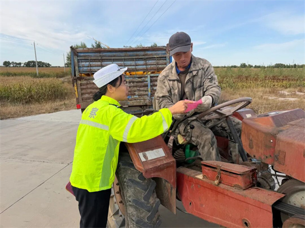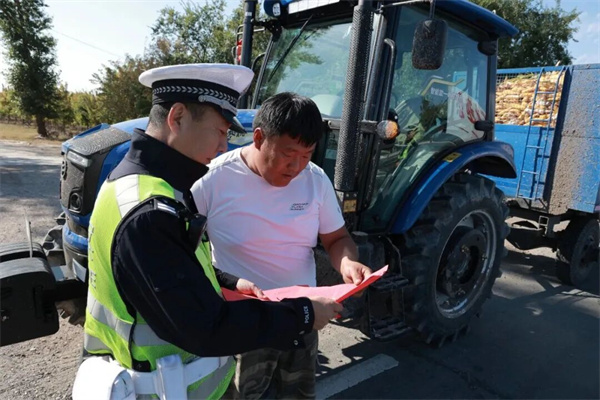 在通化,当地公安交管部门紧紧围绕“护秋收”重点任务,突出推进“亮尾工程”、纠违整治和宣传教育等重点工作,筑牢农村交通安全防线,全力营造安全、畅通的秋季道路交通环境。民警深入乡镇、村屯,对参与秋收作业的农用车辆、驾驶人员进行摸底登记;为无反光标识或反光标识残缺的农用车辆免费粘贴反光贴;严查严控农用车违法载人、货车超载、面包车超员载客等重点违法行为。同时他们还向农民朋友宣传交通安全法律法规和秋收时节出行注意事项,全力提升广大村民道路交通安全意识,引导群众规范出行、谨慎驾车。