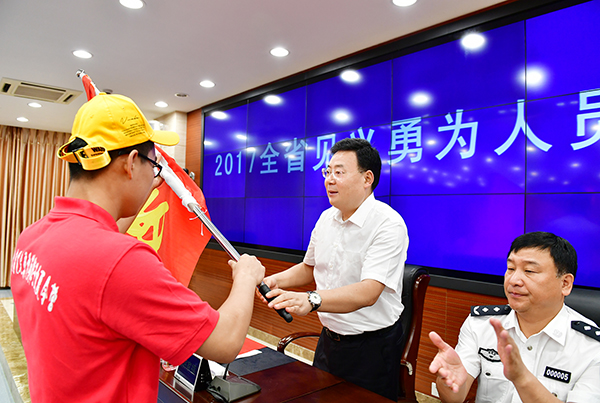 在向夏令营旗手授旗后,胡家福代表省委、省政府和省公安厅党委向参加活动的营员表示欢迎并致以亲切的问候。他指出,近年来,在省委、省政府和各级党委政府的高度重视下,我省见义勇为事业得到蓬勃发展,涌现出了一大批见义勇为先进人物,参加今天夏令营活动营员的父辈就是其中的杰出代表。在他们中间,有的在危难时刻奋不顾身、舍己救人,把生的希望留给别人,把死的危险留给自己;有的大义凛然、挺身而出,与犯罪分子展开殊死搏斗,用鲜血和生命维护了社会的安宁与稳定,他们以实际行动展现出的高尚思想境界、以“义”为先的优秀品质,值得全社会学习和景仰;他们所做出的牺牲和奉献,党和人民永远不会忘记。