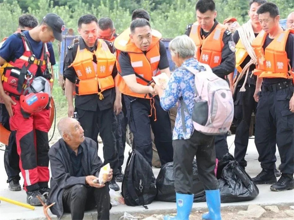 在洪水湍急、山路崎岖、泥泞路段,特警队员背起行动不便老人和小孩,向安全地点转移。抵达安全地点后,一位老人紧紧握住民警的手激动的表达感谢,“小伙子,多亏了你们,是你们救了我们老两口。”
