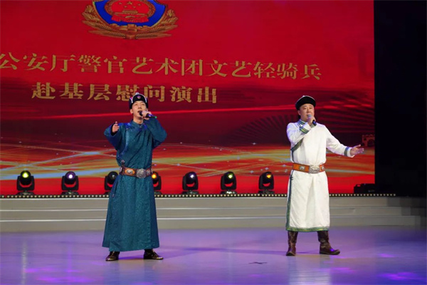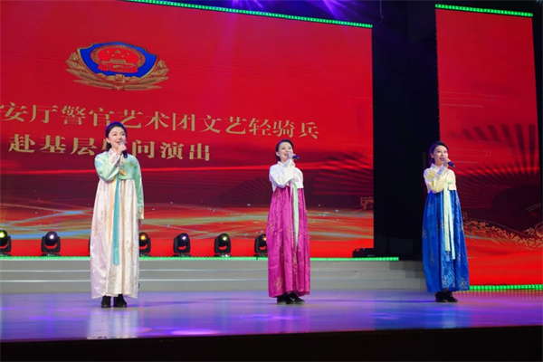 “哪里有战友们奋斗的足迹,哪里就有轻骑兵深情的歌声。”慰问演出在歌伴舞《好运全都来》中拉开序幕。文艺轻骑兵表演的音乐快板《吉林公安勇向前》展现了公安民警拼搏进取、砥砺奋进,深入践行习近平新时代中国特色社会主义思想和党的二十大精神的新作为、新风貌;器乐合奏《英雄牧马人》琴声笛声悠长、气势恢宏;以“警地融合”为背景创作的小品《满意的惊喜》诙谐幽默,生动反映了警民之间的鱼水深情;女声小合唱《春风十万里》、男声独唱《为人民服务》、民歌联唱《满族儿女心向党》《回乡姑娘》《敬酒歌》《红太阳照边疆》《美丽中国》、女声独唱《最美是你》、男声四重唱《不放弃》或激昂大气催人奋进,或宛转悠扬沁人心脾,或地方特色浓郁使人倍感亲切;二人转《错怪》讲述了人民警察的忠诚与担当,道出了警察家属的奉献与付出。演出中,文艺小分队队员向长白山公安局功模民警代表献花,表达对他们的崇高敬意。长白山公安局民警积极参加此次演出活动,情景讲述《藏蓝青春在平凡中闪光》倾情演绎了长白山公安一线民警无私奉献、拼搏担当的高尚情操;四重唱《不忘初心》表达了长白山公安护航经济社会发展、保护人民安宁的坚定信心。演出赢得了在场观众的阵阵热烈掌声,在歌曲《领航》的高昂旋律中落下帷幕。