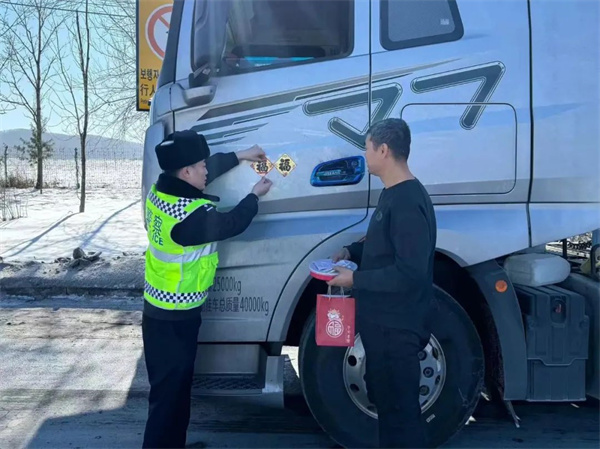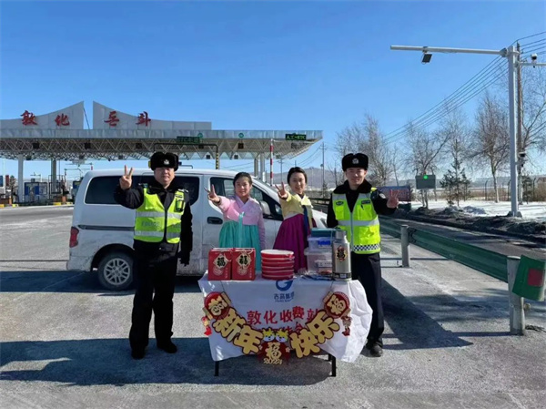 他们联合吉高集团敦化收费站,在敦化收费站入口开展“平安春运·吉祥如意”便民活动,为过往司乘人员、全国各地游客设立便民服务台,提供吉林高速安全驾驶手册、热水、食品饮料福袋、应急药品,使得群众旅客们倍感温馨,纷纷为吉林高速交警点赞。