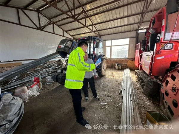 近日,长春市公安局交警支队二道大队联合区农业农村局工作人员深入辖区村屯,开展农机车辆安全检查及交通安全宣传活动,全力筑牢春季农村道路交通安全线。